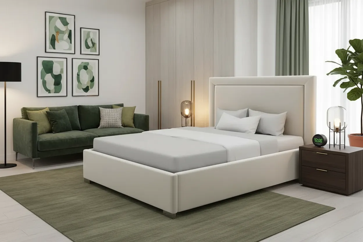 Мягкая кровать с прямым изголовьем и красиво выделенной рамкой — настоящее воплощение элегантности и простоты. Она словно приглашает окунуться в уют и спокойствие после долгого дня. Такая кровать станет прекрасным акцентом в любой спальне, создавая атмосферу уюта и стиля, словно она сама рассказывает свою тихую и красивую историю.