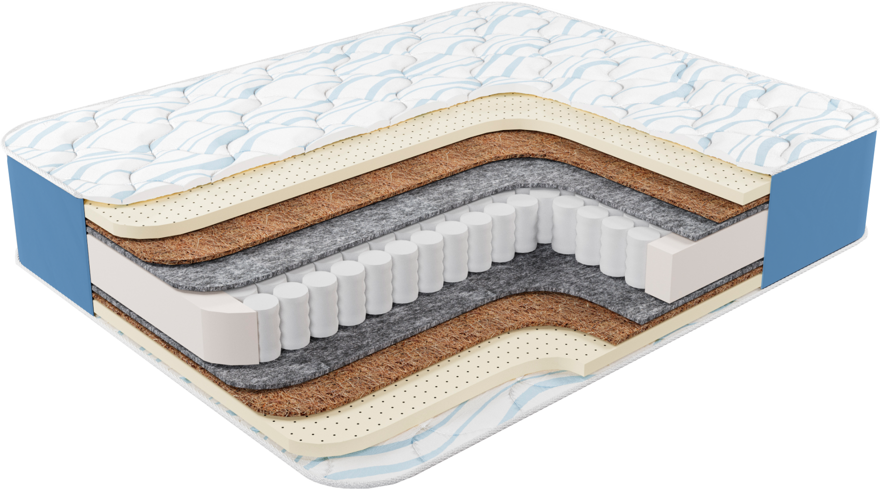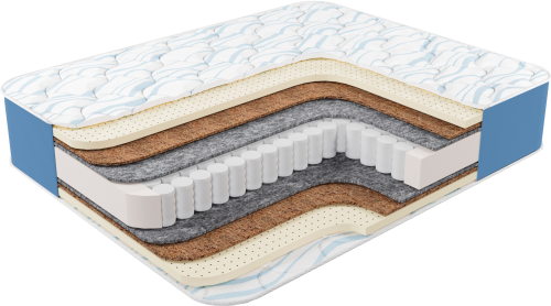 Натуральный латекс высотой 3см в сочетании с кокосовой койрой раскрывают свойства пружинного блока, повторяя анатомические изгибы тела, обеспечивает быстрое засыпание и улыбку каждое утро.